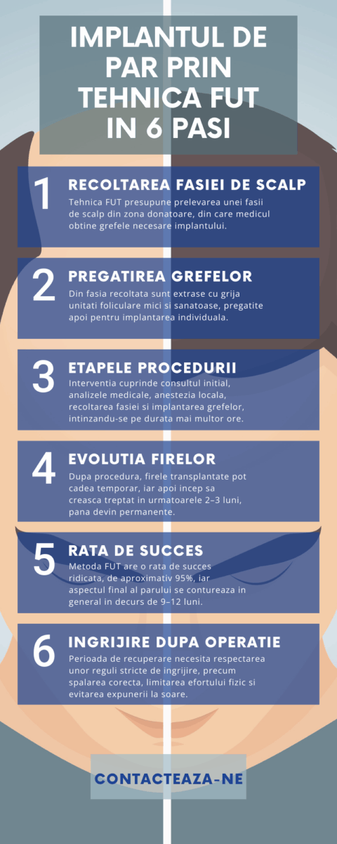 Tehnica FUT presupune recoltarea grefelor sub forma de fasii cu par si implantarea individuala a firelor lor pe zonele afectate.
